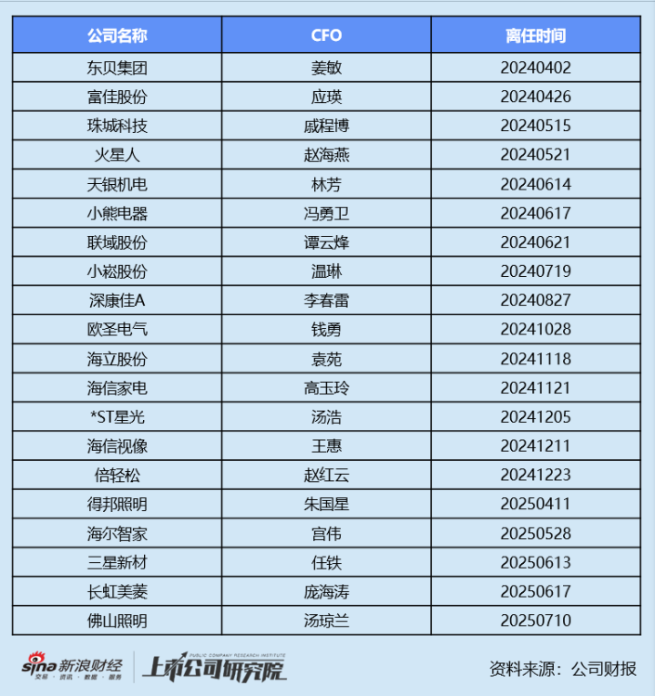 统计区间内,共有20位CFO辞职离任,健康和工作调动为主要原因,75%已由继任者接任。海尔智家、佛山照明、得邦照明、长虹美菱和三星新材的财务总监于2025年4月至7月期间离职,暂时未找到接任者。
